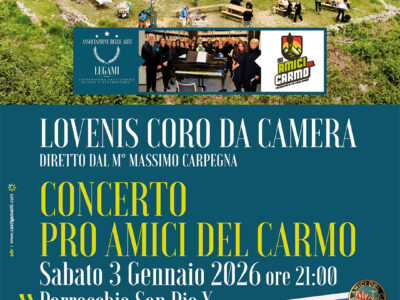 Sabato 3 gennaio 2026, alle ore 21:00, la Parrocchia San Pio X di Loano (Via Bergamo 10 – Salone delle Feste) ospiterà il Concerto pro Amici del Carmo, un appuntamento musicale di grande valore artistico e solidale. Protagonista della serata sarà il Lovenis Coro da Camera,... Leggi di più