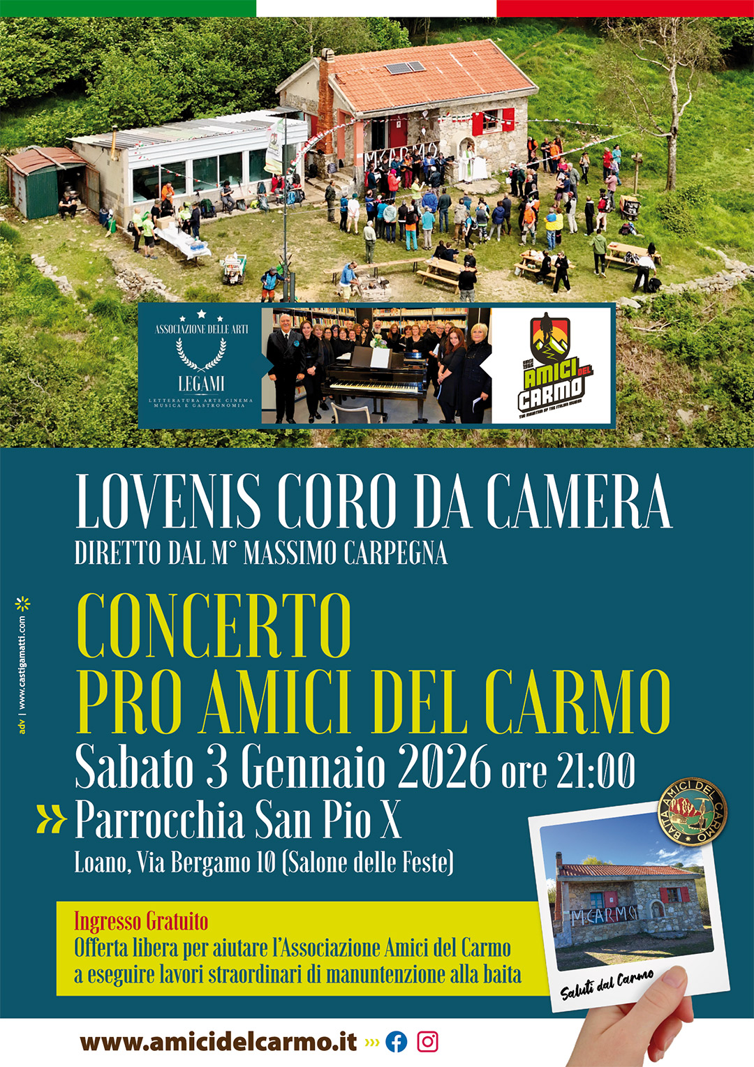 L’evento è promosso dall’Associazione delle Arti “Legami” in collaborazione con l’Associazione Amici del Carmo, con l’obiettivo di sostenere concretamente i lavori straordinari di manutenzione della Baita del Carmo.